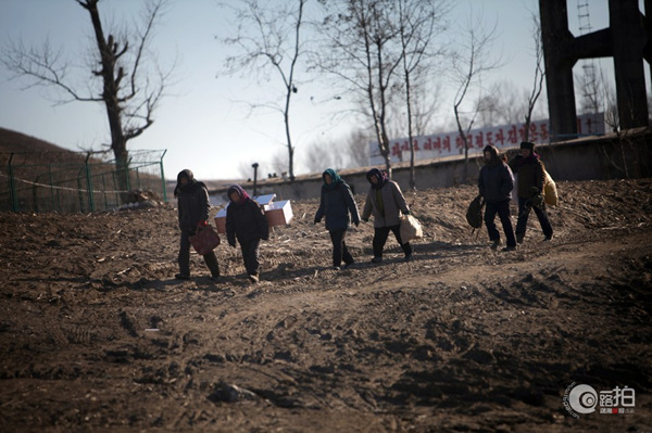 2月2日,朝鲜边境,几名朝鲜妇女背着行李准备渡江到对岸。背后哨所牌子上写着伟大领袖金正恩的标语。