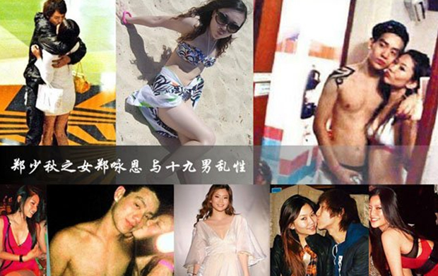 【郑少秋之女郑咏恩与十九男乱性】郑咏恩由于父母过分宠爱,造成其性格比较叛逆。她曾被拍到在圣诞夜跟家人吃完圣诞大餐后,一个晚上连会两个男朋友。之后被秋官送到国外后更变本加厉,一起玩自拍的“男主角”各色人种都有,总共19人,最精彩的一组是郑咏恩和某男子于公厕内半裸拥抱并热吻。
