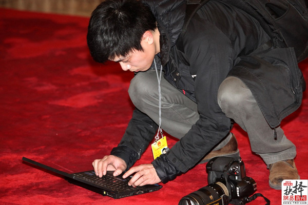 3月3日,北京,围堵政协委员周伯华进行采访的媒体记者。