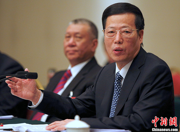 3月4日,中共中央政治局常委张高丽看望出席全国政协十二届一次会议的民建、工商联委员并参加联组讨论。图为张高丽、何厚铧在会上。