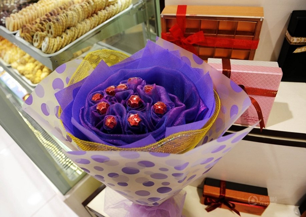 青岛某商场里经过精心包装的十一颗巧克力卖价299元(2月20日摄)。
