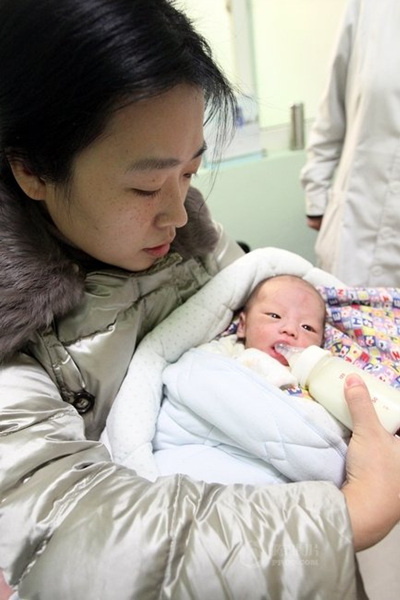 给男婴喂奶。