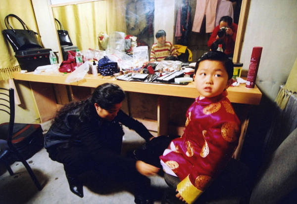 2002年1月6日,梦鸽与儿子李天一拍摄MTV,在后台,梦鸽为李天一换衣服。