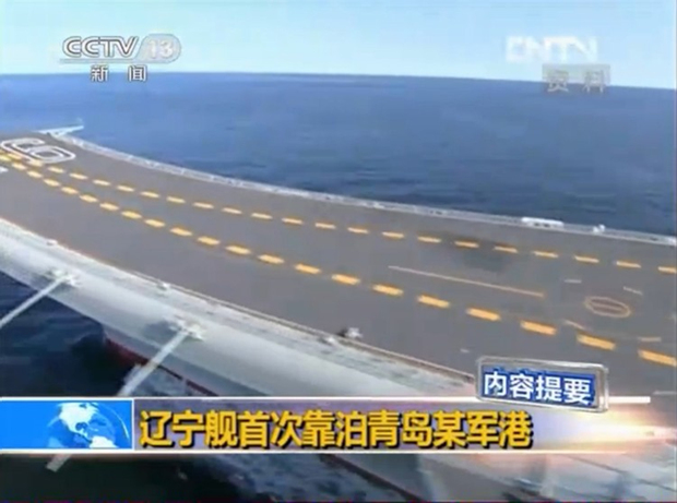 央视新闻节目中对辽宁舰靠泊青岛母港的报道