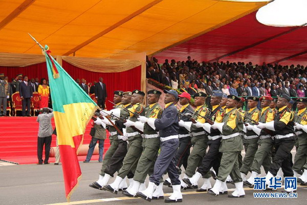 8月15日,在刚果(布)普尔省省会金卡拉,仪仗队在阅兵式上行进。