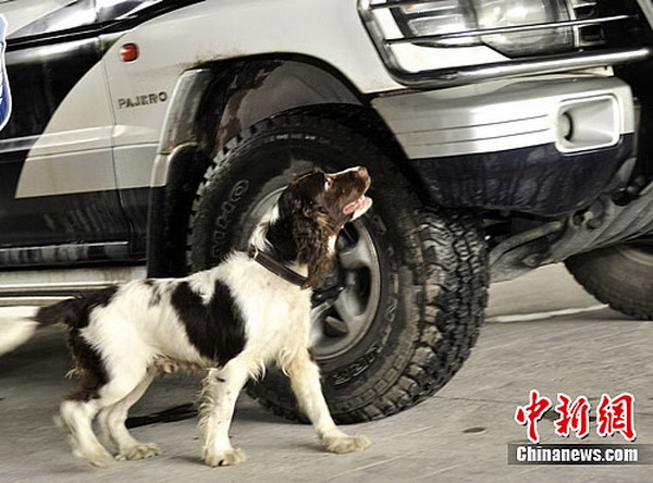 搜爆犬“欢欢”在汽车周围搜索爆炸物品。警方供图